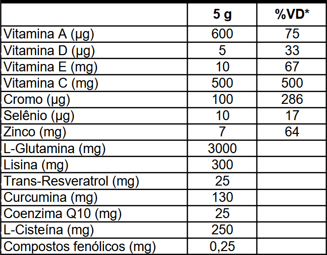 L-glutamina, ascorbato de cálcio (vitamina C), cloridrato de L-lisina, L-cisteína, extrato de rizomas de Curcuma longa L., polpa de limão em pó, bisglicinato de zinco, trans-resveratrol sintético, coenzima Q10, acetato de DL-alfa-tocoferol (vitamina E), extrato de própolis, pimenta preta, L-selenometionina (selênio), picolinato de cromo, acetato de retinol (vitamina A) e colecalciferol (vitamina D). Aroma idêntico ao natural de laranja (Sabor Laranja) / Aroma idêntico ao natural de Abacaxi(Sabor Abacaxi com Hortelã), acidulante ácido cítrico, antiumectante dióxido de silício e edulcorante sucralose.